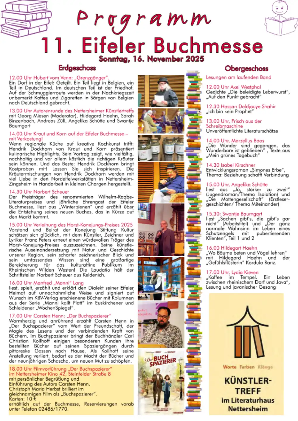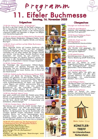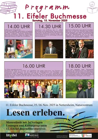 Die Eifeler Buchmesse, eine Veranstaltung des Literaturhauses Nettersheim und der Lit.Eifel, ist mit ihrem breiten Spektrum ein beliebter Treffpunkt für Verlage, Autor:innen und Literaturfreund:innen geworden, die genüsslich stöbern, angeregt debattieren oder ein reichhaltiges kulturelles Rahmenprogramm genießen wollen.